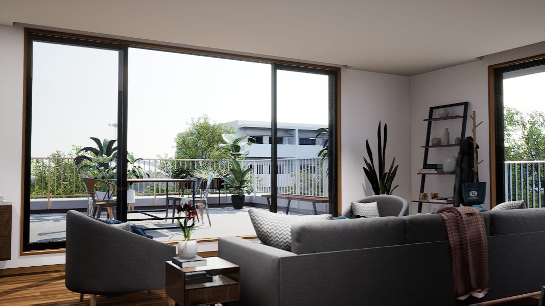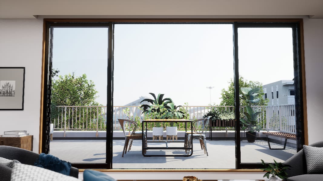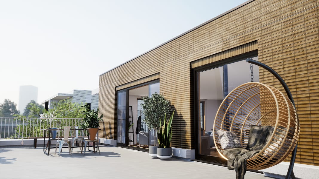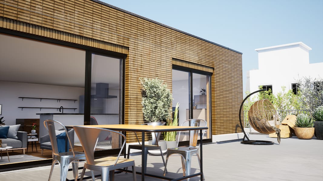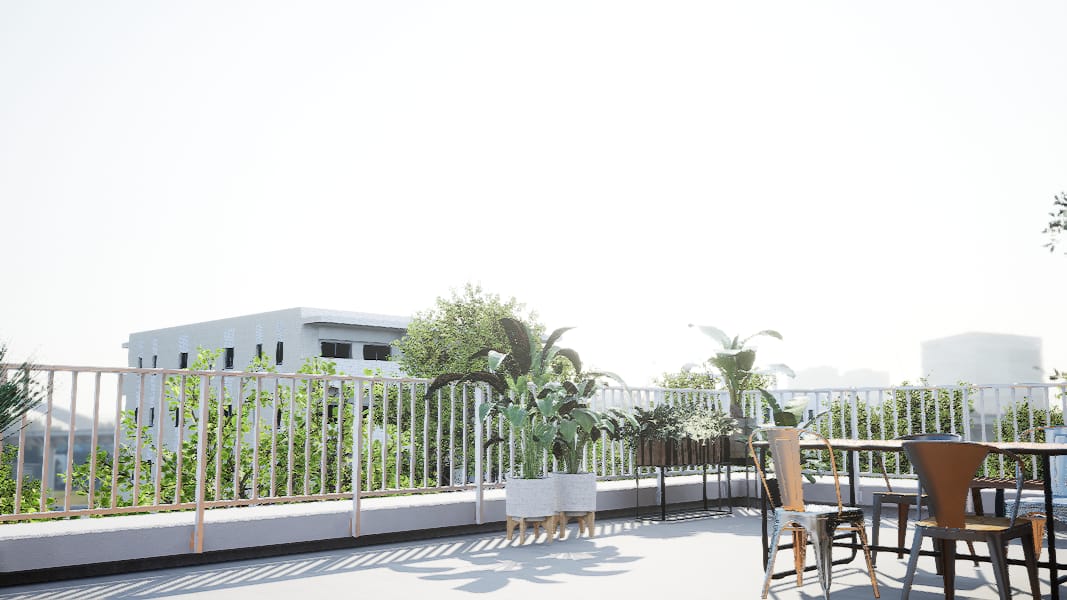 広いテラス付き都会のマンション。室内にリビングダイニングも