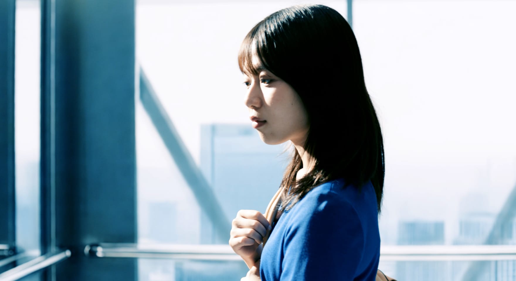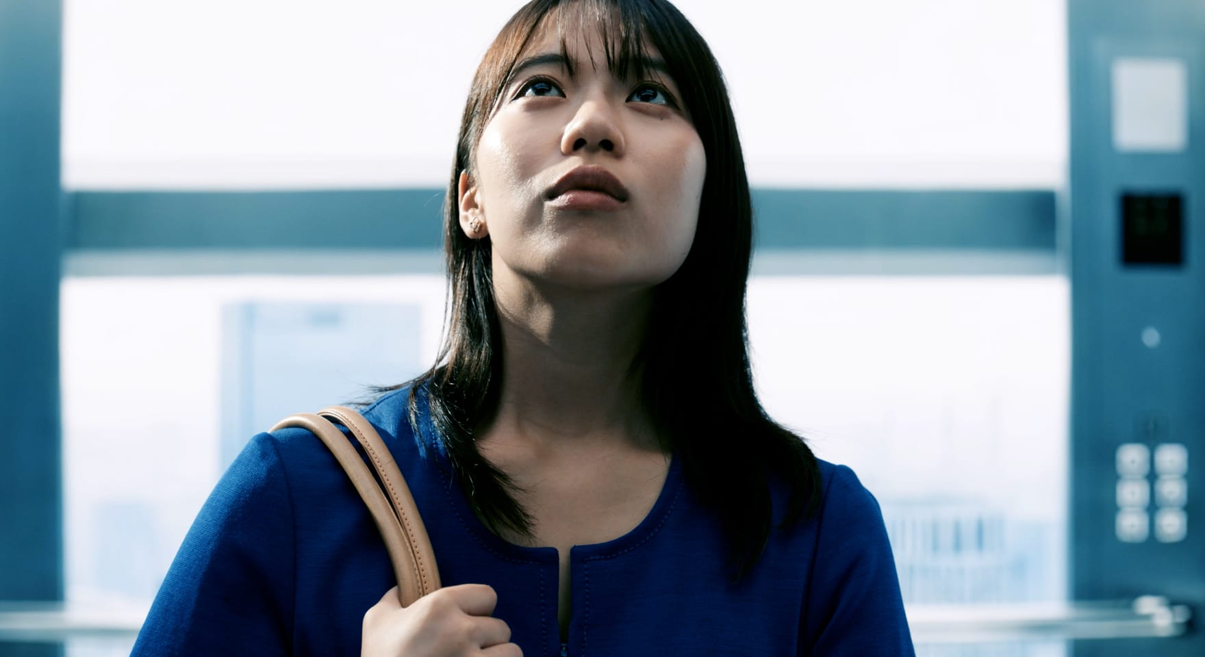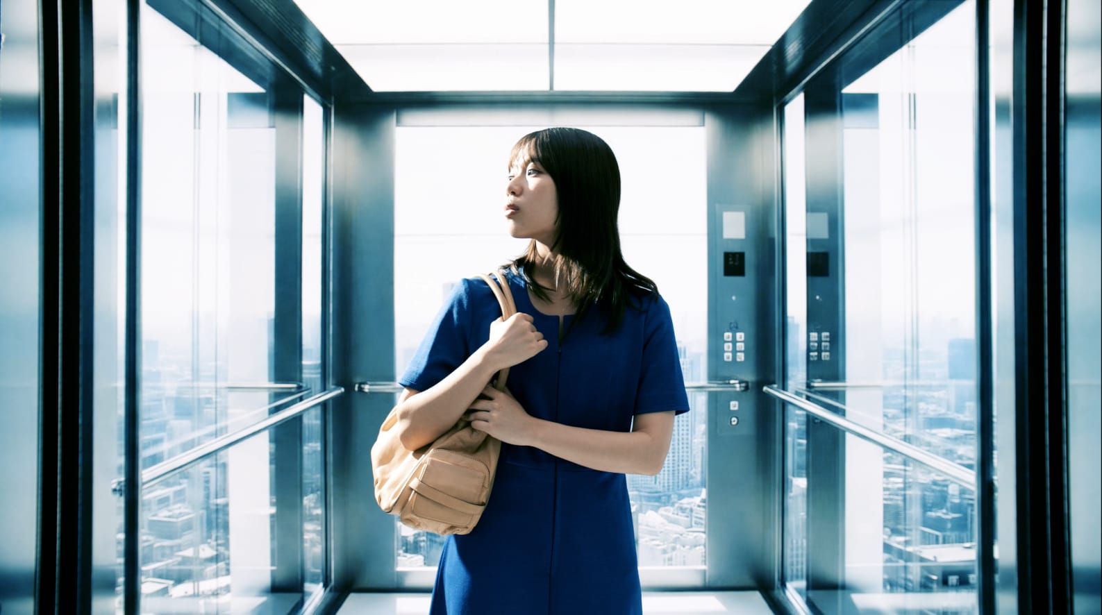 ガラス張りの都会のビルのエレベーター